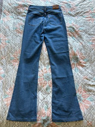 Pantalón vaquero de mujer con corte acampanado. Presenta un diseño moderno y favorecedor. - Tiro alto. - Pierna ancha. - Detalle de rotura en rodilla. - Precio negociable.