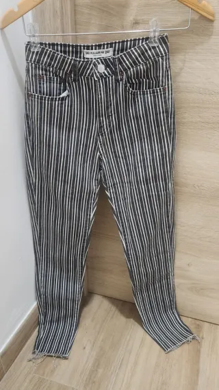 Pantalones vaqueros a rayas verticales negras/grises y blancas, tiro alto, pitillo (skinny), Pull&bear talla 34. Como nuevos, usados 2 veces.