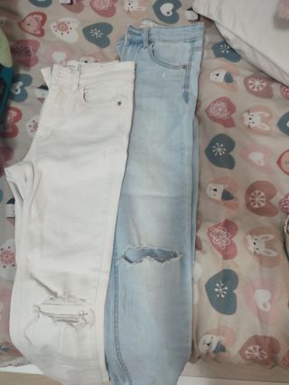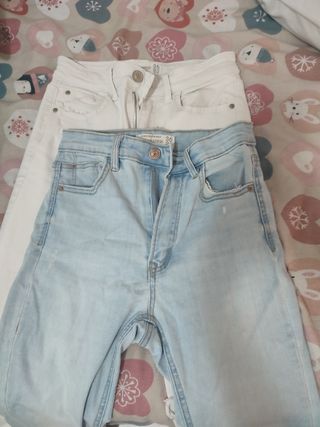 Me gustaría vender estos pantalones pitillo de Stradivarius. Están en buen estado. - Dos pantalones. - Colores: azul y blanco. - Diseño pitillo.