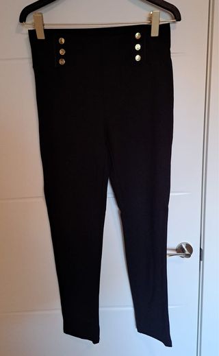 ¡ESTILIZA Y ES MUY CÓMODO! Vendo pantalón negro tipo pitillo de Cortefiel. Tejido con cuerpo pero muy elástico, ideal para un look de oficina cómodo o estilo marinero. - Talla: S. - Estado: Muy buen estado, color negro intenso. - Detalles: Tiro alto con botones dorados decorativos que favorecen mucho. - Medidas en plano: Ancho de cintura 34 cm / Largo 97 cm. Al ser elástico se adapta genial a la figura. Hago envíos rápidos por Wallapop. ¡Escríbeme si tienes dudas!