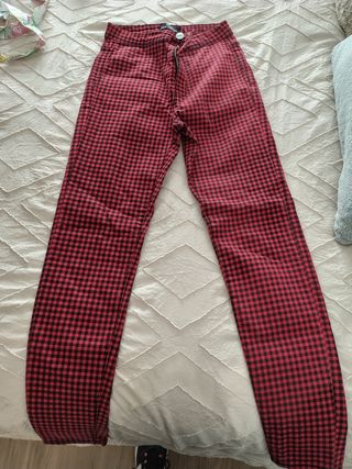 Pantalón vaquero con un diseño de rayas verticales talla 38 (nuevo) Pantalón vaquero con diseño de cuadros negro y rojo talla 36 (en buen estado) Cada pantalón a 5€