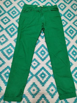 Pantalones largos de la marca Sfera, en color verde y talla 42. Son de un tejido agradable al tacto y presentan un corte recto. - Tienen un buen estado de conservación. - Ideales para el día a día.