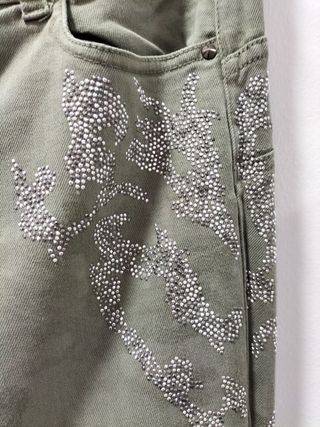 Pantalón pitillo de la marca Twinset en color verde. Presenta un diseño con pedrería. - Detalle de pedrería en forma de flores. - Corte pitillo. - Cierre con botón y cremallera.