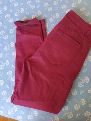 Pantalones pitillo de la marca Cortefiel en un bonito color buganvilla. Talla 38 de Cortefiel. - Diseño ajustado. - Cintura con trabillas. - Costuras delanteras marcadas.