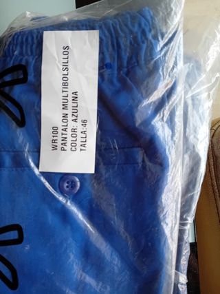 Pantalon mujer azul talla M. Lleva goma en la cintura y dos bolsillos laterales en la cadera. Lleva otros dos bolsillos en los lados de cada pierna. Camal ancho. Es de verano tela poliester fino. Estan sin estrenar y con etiqueta. Sirve para trabajar o para vestir comodo