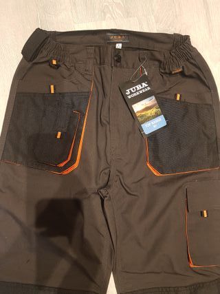 Pantalón de trabajo JUBA con detalles en naranja de hombre. - Cintura elástica. - Múltiples bolsillos. - Refuerzos en zonas de desgaste. Tengo dos pares, este y otro a estrenar sin etiqueta. LOS DOS POR 30 EUROS.