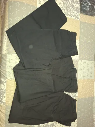 Conjunto de tres pantalones de cocina. Importante: NO TIENEN TALLA PERO PIENSO QUE EQUIVALE A UNA L UNO DE ELLOS TIENE UNA LIGERA MANCHA EN LA PARTE BAJA EL PUNTO QUE SE VE EN EL PANTALON DE LA IZQ NO ES UNA MANCHA ES EL FLASH DEL MOVIL - Color negro. - Diseño de pantalón de trabajo.