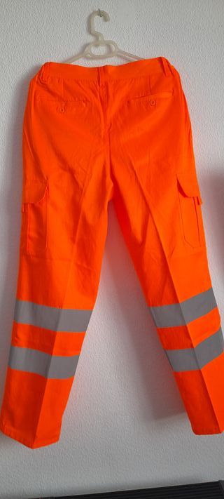 Pantalón de trabajo de alta visibilidad. con reflectantes, varios bolsillos, sin estrenar. con cintura elastiaca, valido para talla 42 /44 - Color naranja brillante. - Bandas reflectantes plateadas en las piernas. - Cintura elástica. - Bolsillos laterales.