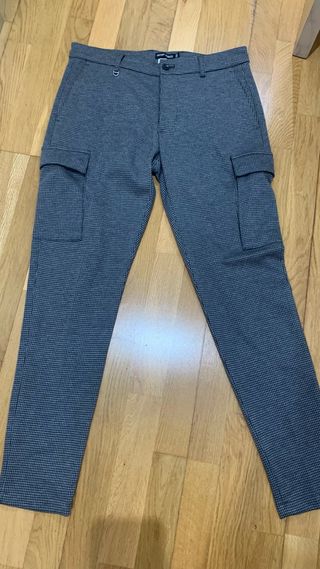 Pantalón de vestir con un diseño moderno y práctico. Vendo pantalón antony morato smoke súper skinny fit en perfecto estado talla 48/34 - Estampado de cuadros pequeños. - Bolsillos cargo en los laterales. - Detalle de anilla metálica en la cintura.