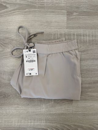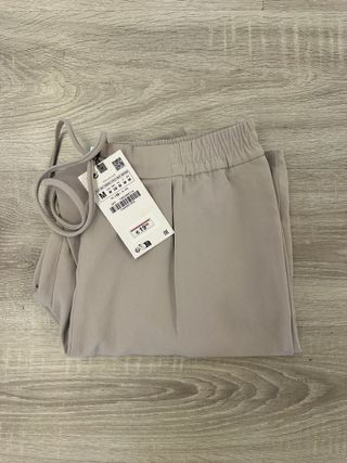 Pantalón de vestir Zara en color beige. Cuenta con cintura elástica y cordón ajustable. Bolsillos laterales. Tejido suave y ligero. SIN ESTRENAR. TALLA M.