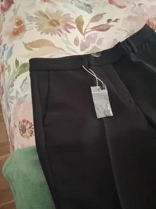 Pantalones negros de vestir con un diseño elegante. - Cintura alta con trabillas, pone talla 40, pero es muy estrecho de cintura, una talla 38 - Pinzas delanteras. - Dobladillo en los bajos.