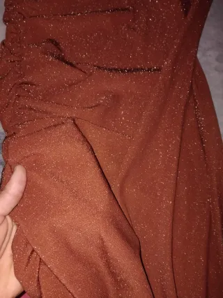 Vestido con un acabado brillante y detalles drapeados. - Color marrón con destellos dorados. - Tejido con textura. - Diseño elegante.