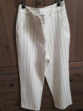 Pantalón de vestir de mujer en blanco roto con raya diplomática. Tejido muy suelto, con caída. De Primark talla 40. Queda precioso puesto. Está como nuevo, se vende porque he perdido mucho peso y para esta temporada me quedaba grande. En mi perfil hay subidas muchas prendas más! . Si te interesa lo que ves, pasa por el resto de mi perfil, más cosas... Comprando varios artículos, ajustamos el precio!!!