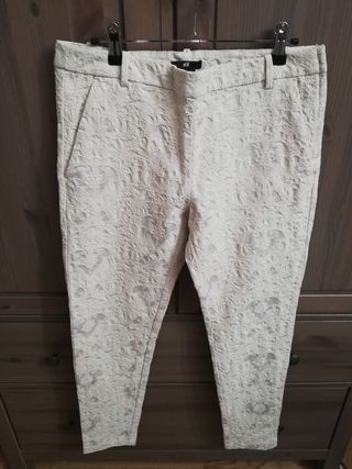Pantalón de vestir de mujer en hueso, un tono neutro muy combinable y con preciosa tela brocada(también vendo otro en azul cobalto similar) . Se adapta muy bien a la silueta. De HyM talla 42. Está como nuevo, se vende porque he perdido mucho peso y para esta temporada me quedaba grande. En mi perfil hay subidas muchas prendas más! . Si te interesa lo que ves, pasa por el resto de mi perfil, más cosas... Comprando varios artículos, ajustamos el precio!!!