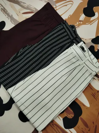 Conjunto de tres pantalones de vestir con diferentes estampados. - Pantalón liso color vino. - Pantalón de rayas verticales negras y blancas. - Pantalón de rayas verticales blancas y negras.
