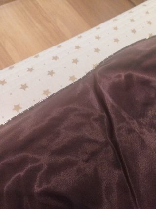 Traje raso color vino. Cuerpo con pequeñas piedrecitas en ribete. Pantalón acampanado.