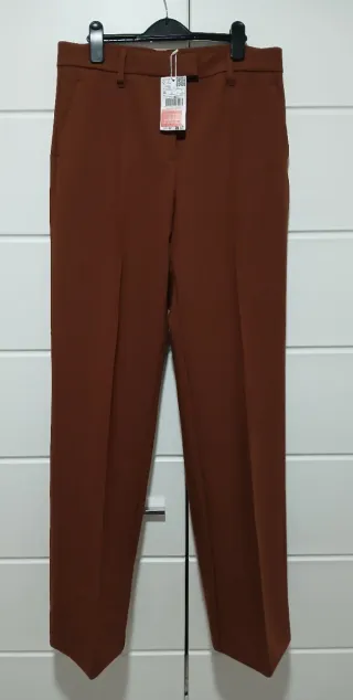 Pantalón de vestir Trafaluc en color caldera. Diseño moderno y cómodo. - Bolsillos laterales. - Cierre de botón y cremallera. - Pierna ancha.