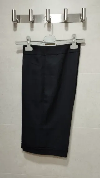 Pantalones de vestir negros hasta la rodilla. - Talla 42. - Bolsillo trasero decorativo con botón. - Se le pueden hacer pinzas con la plancha, pero no es necesario si no se quiere. - Dobladillo visto en la parte baja.
