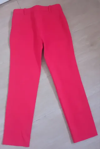 Pantalón de vestir de Zara en color rosa, talla S. - Corte recto. - Detalle de raya diplomática lateral en negro. - Cierre con cremallera y botón. - Bolsillos delanteros.