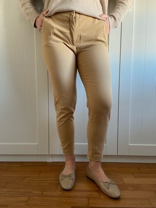 Pantalón de vestir de Zara en color beige. - Cierre de cremallera y botón. - Dos bolsillos laterales. - Uno de los bolsillos interiores tiene un agujero.