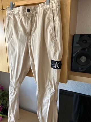 Pantalón de vestir Calvin Klein en color beige. - Diseño moderno y cómodo. - Parche con logo en la pierna.