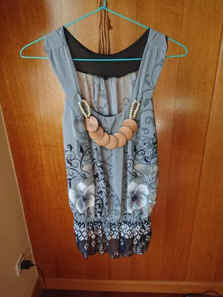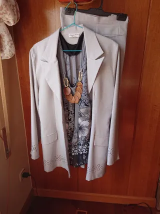 Elegante conjunto de pantalón de verano en color gris claro. Ideal para ocasiones especiales o para el día a día. - Chaqueta tipo blazer con detalles calados en los bajos y mangas y solapas de bolsillos falsos laterales. - Pantalón de vestir a juego pesquero xla pantorrilla. - Blusa estampada con flores en tonos grises y negro y collar decorativo de madera. - Apenas usado un par de ocasiones.