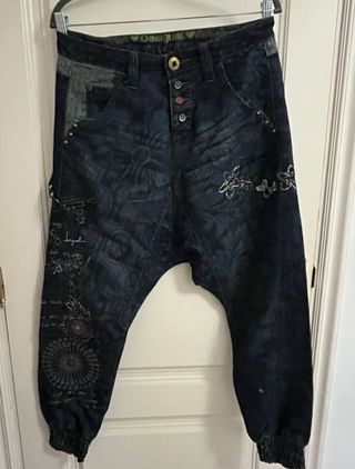 Pantalones tejanos con un diseño único y llamativo. Precio negociable - Estampado floral y ornamental. - Corte holgado con puños ajustados. - Detalles de tachuelas y bordados.