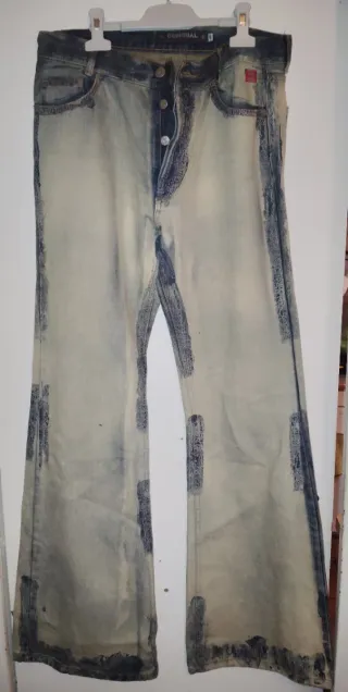 Pantalones vaqueros de la marca Desigual, en color azul. Son de corte recto y presentan un diseño único con detalles desgastados y estampados en la parte trasera. Usados en muy pocas ocasiones porque quedaron pequeños, por lo que están como nuevos. - Talla: No tienen ninguna etiqueta con la talla pero en las últimas fotos están las medidas del pantalón. El largo son 108 cm. - Bolsillos funcionales - Cierre de botón y cremallera