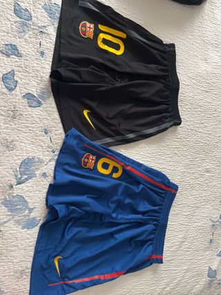 Dos pantalones cortos de fútbol del FC Barcelona. - Pantalón negro con el número 10. - Pantalón azul con el número 6. - Incluyen el escudo del club y el logo de Nike. Precio los dos pantalones.