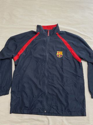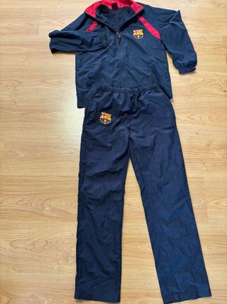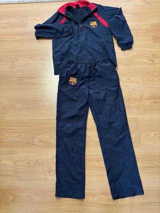 Conjunto deportivo del FC Barcelona. - Sudadera de manga larga con cremallera. - Pantalón largo con cordón en la cintura. - Escudo del FC Barcelona en ambas prendas. - Detalles de rayas en las mangas y laterales.