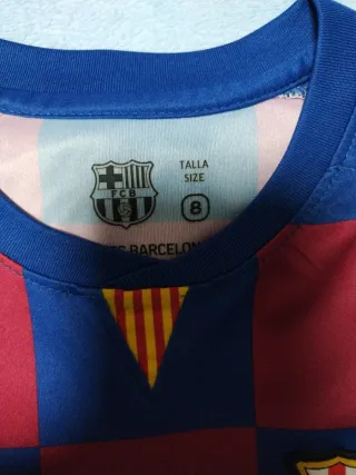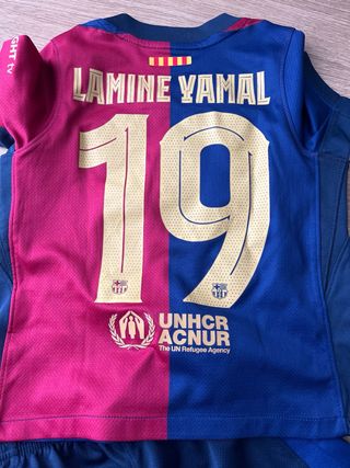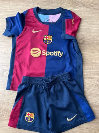 Equipación de fútbol del FC Barcelona, talla Lamine Yamal. - Camiseta y pantalón corto. - Diseño dividido en dos colores: azul y granate. - Logos de Nike, Spotify y el escudo del club. - Detalles en color dorado. Talla xs 98-104