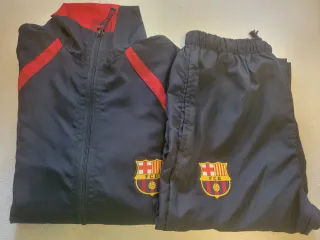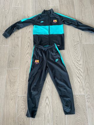 Conjunto deportivo para niño del FC Barcelona. - Chaqueta con cremallera completa. - Pantalón con cintura elástica. - Diseño con escudo bordado. - talla M (137-147 cms) - ligero desgaste en una rodilla
