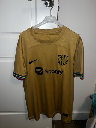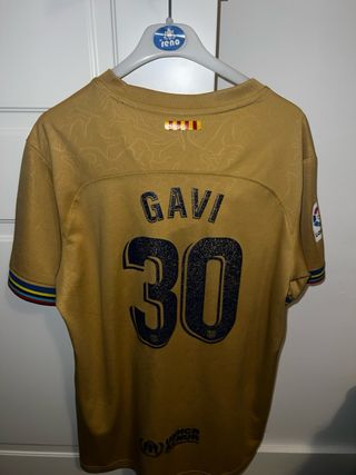 Camiseta de fútbol del FC Barcelona, temporada 2023, con el dorsal de Gavi. - Diseño en color dorado. - Logo de Spotify en el frontal. - Escudo del FC Barcelona. - Detalles en las mangas. Incluye pantalón Se aceptan rebajas Pequeños defecto, tercera foto