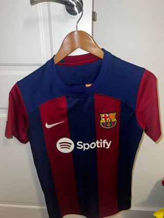 Equipación de fútbol del FC Barcelona para niñ@s comprado en la tienda oficial del Barcelona. No se ha usado por error en la talla. TALLA 122-128 cm ( como para 6-8 años) Precio 100 € en tienda - Camiseta y pantalón. - Diseño a rayas rojas y azules. - Escudo del club. - Logo de Spotify. - Logo de Nike.