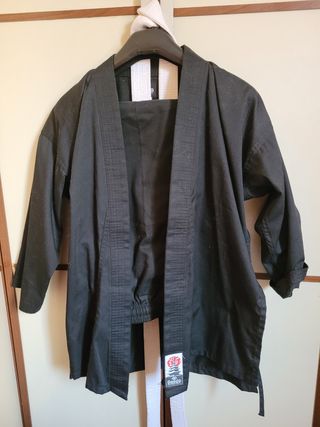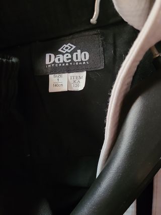 Se vende Karate-gi de la marca DaeDo. Es de color negro y parece estar en buen estado. - Talla infantil 140 - Incluye chaqueta y pantalón - Cinturón blanco incluido