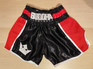 Pantalón corto de kick boxing de la marca Buddha Fight Wear. Diseñado para entrenamientos y competiciones. - En la etiqueta aparece talla XL pero equivaldría a una M/L - Cintura Elástica - Marca Buddha Fight Wear, logos visibles -En perfecto estado
