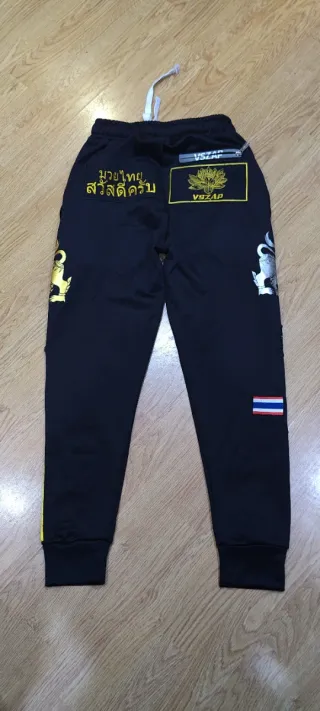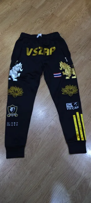 Pantalón VSZAP talla S, estilo jogger para entrenamiento de Muay Thai / MMA / boxeo. Medidas: Cadera: 106 cm contorno x Cintura: 66 cm contorno x Largo: 98 cm en plano. Color negro con detalles dorados (Kirin y flores de loto) y bandera de Tailandia, diseño muy llamativo. Cintura elástica con cordón para ajuste cómodo y bolsillos con cremallera y sin cremallera. Estado: Nuevo sin etiqueta. PVP 67€. Entrega en mano en Barcelona o envío por Wallapop. Vszap, muay thai, mma, kickboxing, pantalón chándal, jogger, thai boxing, boxing, training pants, talla s, bolsillos cremallera