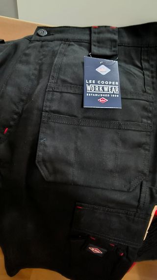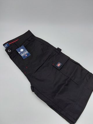 Pantalón corto de trabajo con múltiples bolsillos, ideal para profesionales. La talla es W34 de ancha, no es una S como pone, no puedo ponerlo detallado debido a wallapop, pero es una 34/44, yo diria que es para alguién que usa una L o M de camiseta. Marca: Lee Cooper Material: 65% poliéster, 35% algodón Diseño holgado para movimientos fáciles y flexibles. Dos bolsillos de doble pared en las piernas con cierre de solapa y compartimento para teléfono móvil. - Diseño con bolsillos tipo cargo. - Cierre de botón y cremallera. - Costuras reforzadas en contraste.