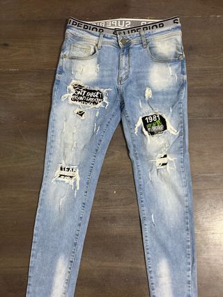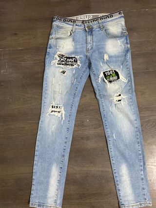 Pantalón vaquero de hombre con un estilo moderno y desgastado. Presenta parches decorativos y rotos que le dan un toque urbano. - Diseño con rotos y parches. - Cintura elástica con logo. - Estilo casual y juvenil.