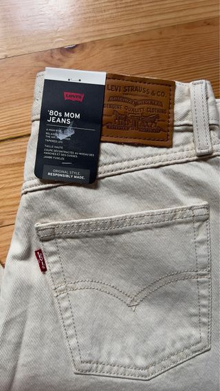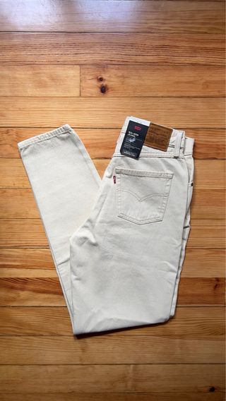 Levi’s beige pitillo. En una pierna tiene un pellizquito pero no es agujero( muestro en la foto para que se vea). W 31/ L 34.