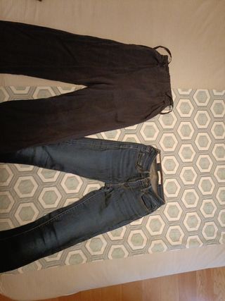 Conjunto de dos pantalones. - Un pantalón Levis azul talla 24. Modelo 715 bootcut. Ligeramente acampanados en la parte baja de la pierna - Un pantalón azul marino de pierna ancha muy liviano.