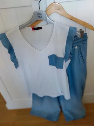 Conjunto de prendas de ropa diseñadas para el embarazo. Incluye: - 1 camiseta de tirantes talla L - 2 camisetas manga larga - 1 pantalón corto talla 44 - 2 mallas largas talla L - 2 pantalones vaqueros largos talla 44