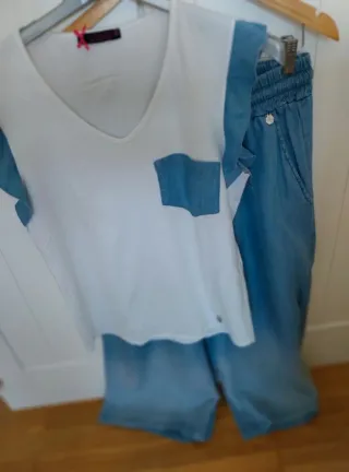 Conjunto de camiseta y pantalón de la marca Lolittas y Lolos. - Camiseta blanca con detalles vaqueros en mangas y bolsillo. - Pantalón vaquero largo con cintura elástica.