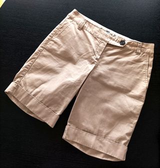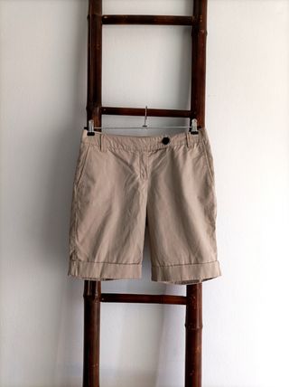 Pantalones cortos de tela en color beige. Tienen un diseño moderno y son cómodos. - Cierre de botón y cremallera. - Bolsillos delanteros. - Cintura con trabillas para cinturón.