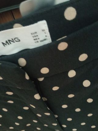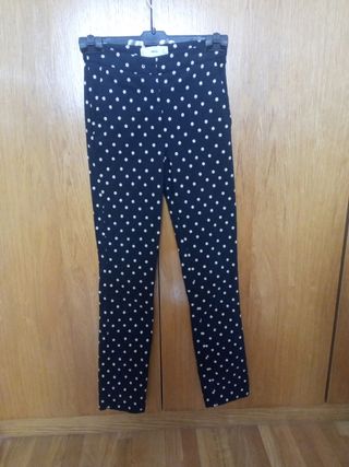 chulísimos pantalones de mango marino con lunares beige ajustados . talla 32 pero elásticos bolsillos laterales usados una vez largo total 92 cm ancho cintura 31cm descuento al comprar varios pantalones de la talla 32.
