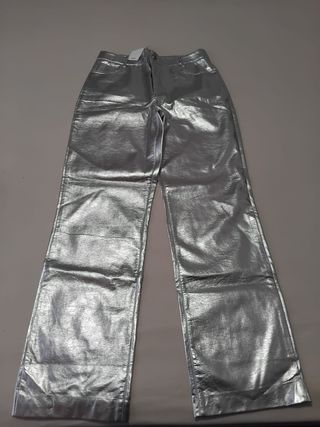 Pantalón de efecto piel con un acabado brillante. - Diseño de tiro alto. - Cierre con cremallera y botón. - Bolsillos delanteros y traseros.
