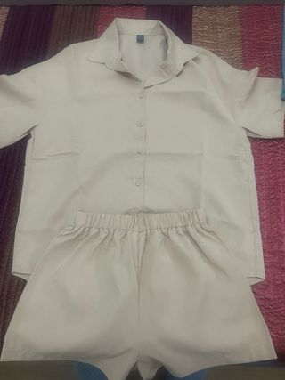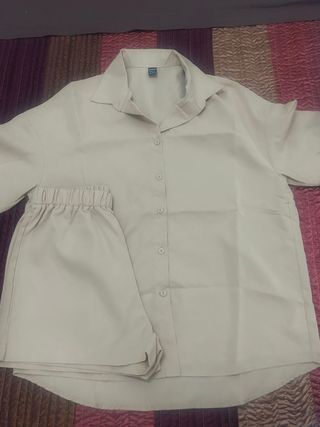 Conjunto de dos piezas en color beige, ideal para un look casual. - Camisa de manga corta con cuello. - Pantalón corto con cintura elástica.
