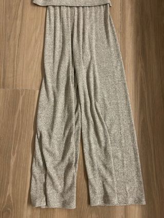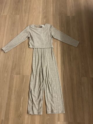 Mono largo de Zara en color beige. Es un conjunto de dos piezas, top de manga larga y pantalón. - Tejido de canalé. - Top corto. - Pantalón de pierna ancha.