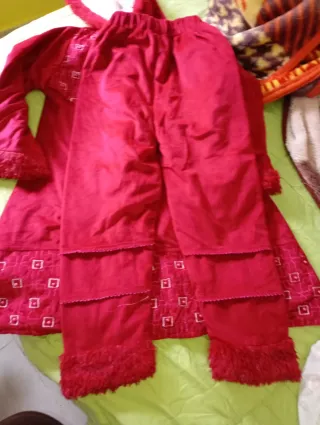 Conjunto de ropa tradicional de la India o Pakistán. - Diseño con bordados cuadrados blancos. - Mangas largas acampanadas. - Pantalones con detalles de volantes y flecos.