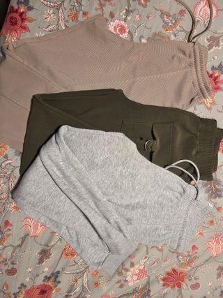 Conjunto de tres pantalones de chándal. - Un pantalón de color beige. - Un pantalón de color gris. - Un pantalón de color verde oliva.